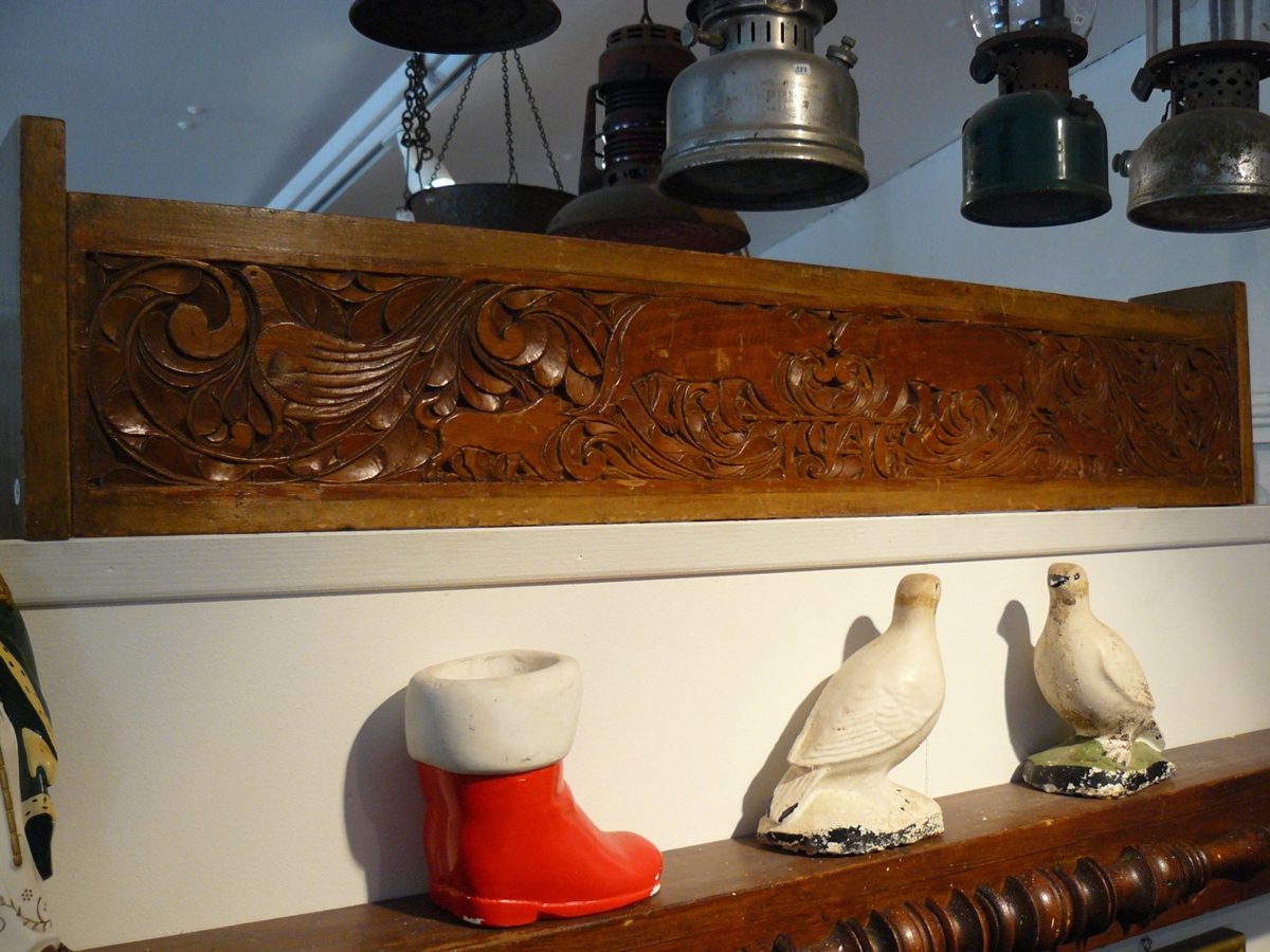 Útskorin hilla sem var í eigu hjónanna frá Réttarholti í Garði, Guðrúnar Guðmundsdóttur og Guðjóns Björnssonar.