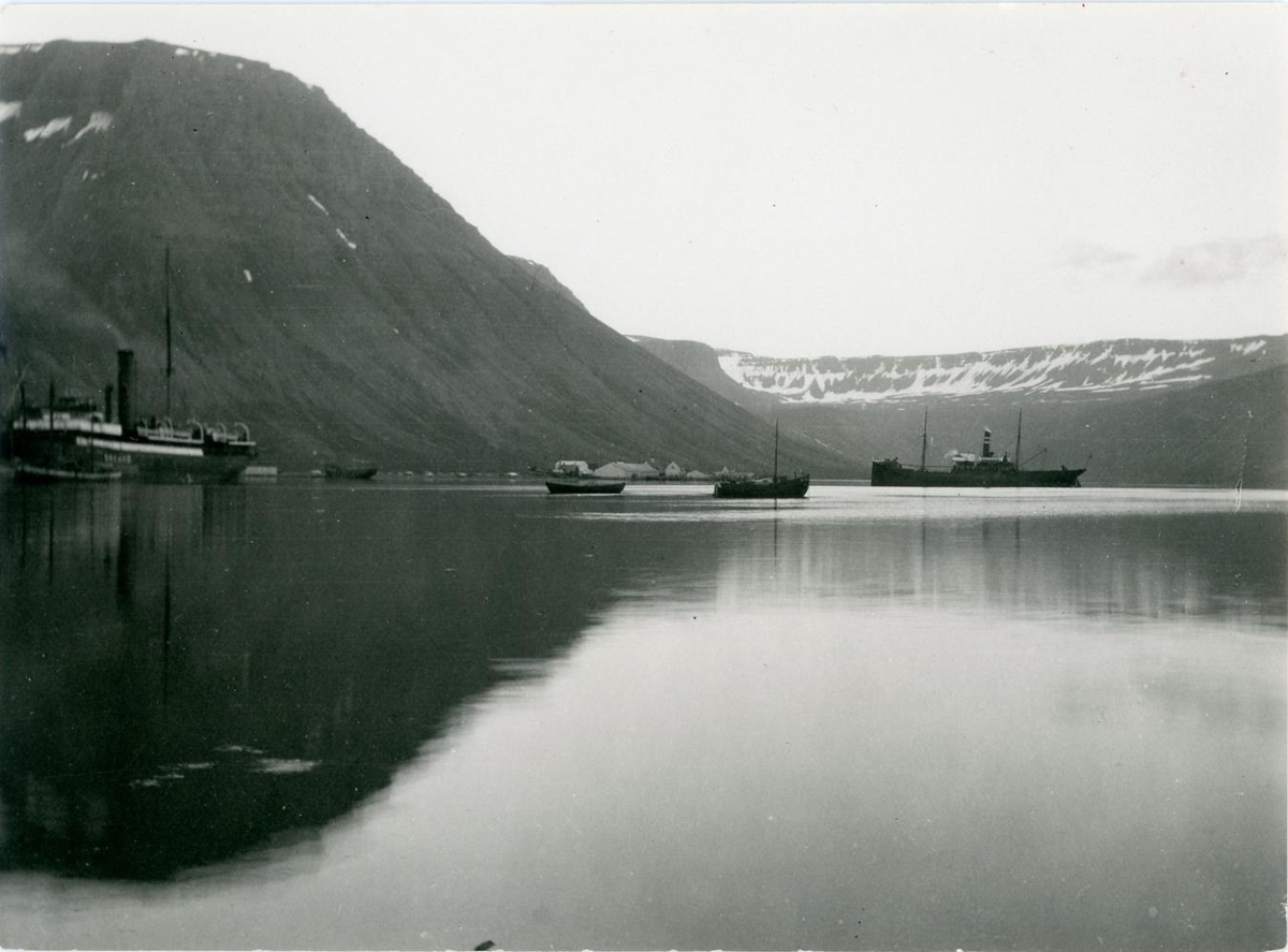 Nokkur skip, gufuknúin flutningaskip og minni bátar, á Pollinum við Ísafjörð.