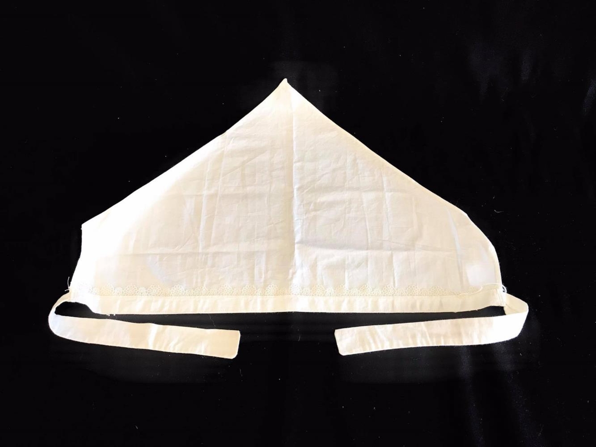 Hvítur kappi með mjórri blúndu á langhlið fram að böndum. Saumaður á Kvennaskólanum á Laugalandi og notaður þar. Sigríður var í kvennaskólanum veturinn 1942-43.