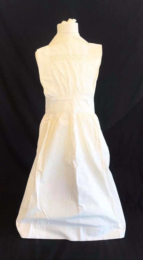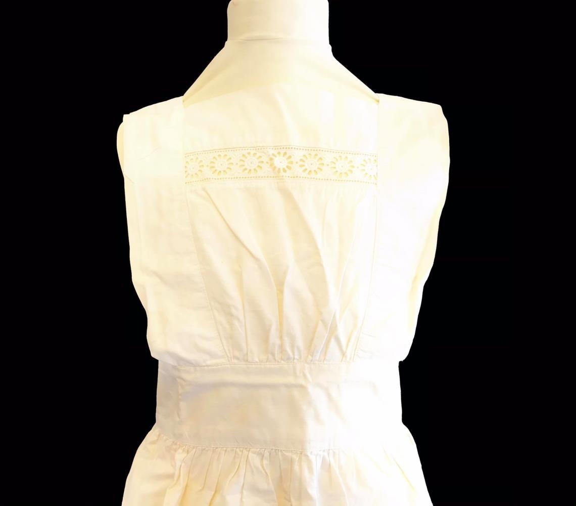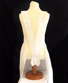Hvít svunta með litlu brjósti og stuttum böndum. Lítill og stuttur blúndubekkur með blómamunstri á brjósti.