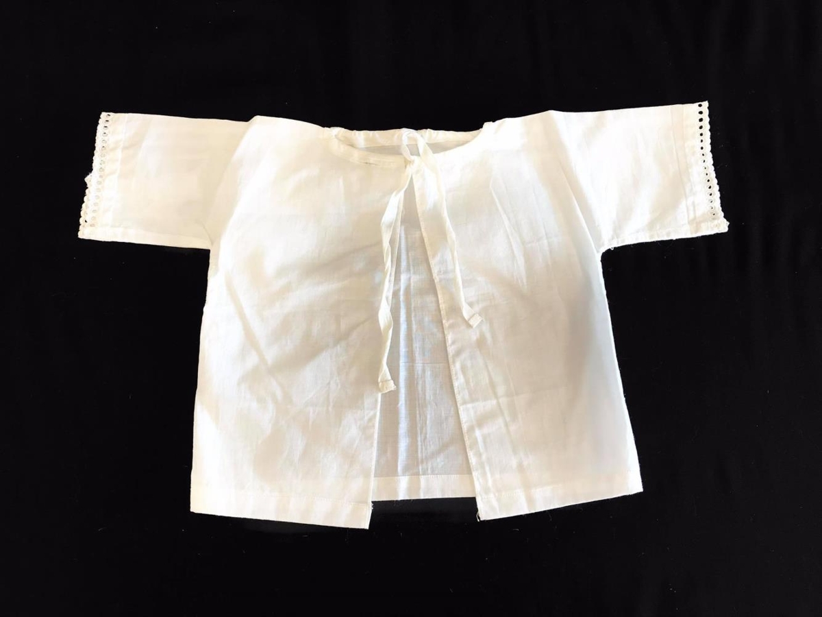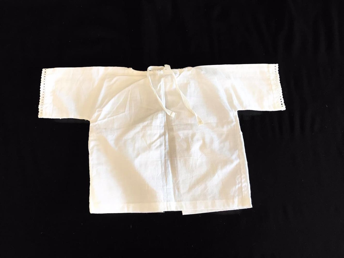 Hvít ungbarnatreyja. Bundin saman að aftan í hálsmáli. Mjó blúnda á ermalíningu, annars afar einföld og án skrauts.