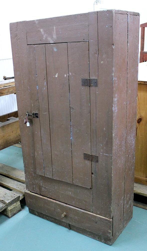 Skápurinn er brúnmálaður. Í honum eru tvær hillur og skúffa neðst, sem hefur að geyma nokkra leðurafganga, sem ekki eru skráðir. Skápurinn er fremur gróf smíði.