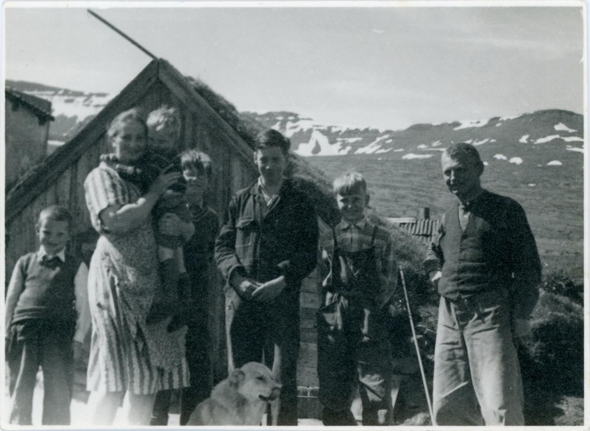 Heimafólk á sveitabæ stillir sér upp til myndatöku framan við bæinn. Heimilishundurinn situr framan við hópinn að vanda.