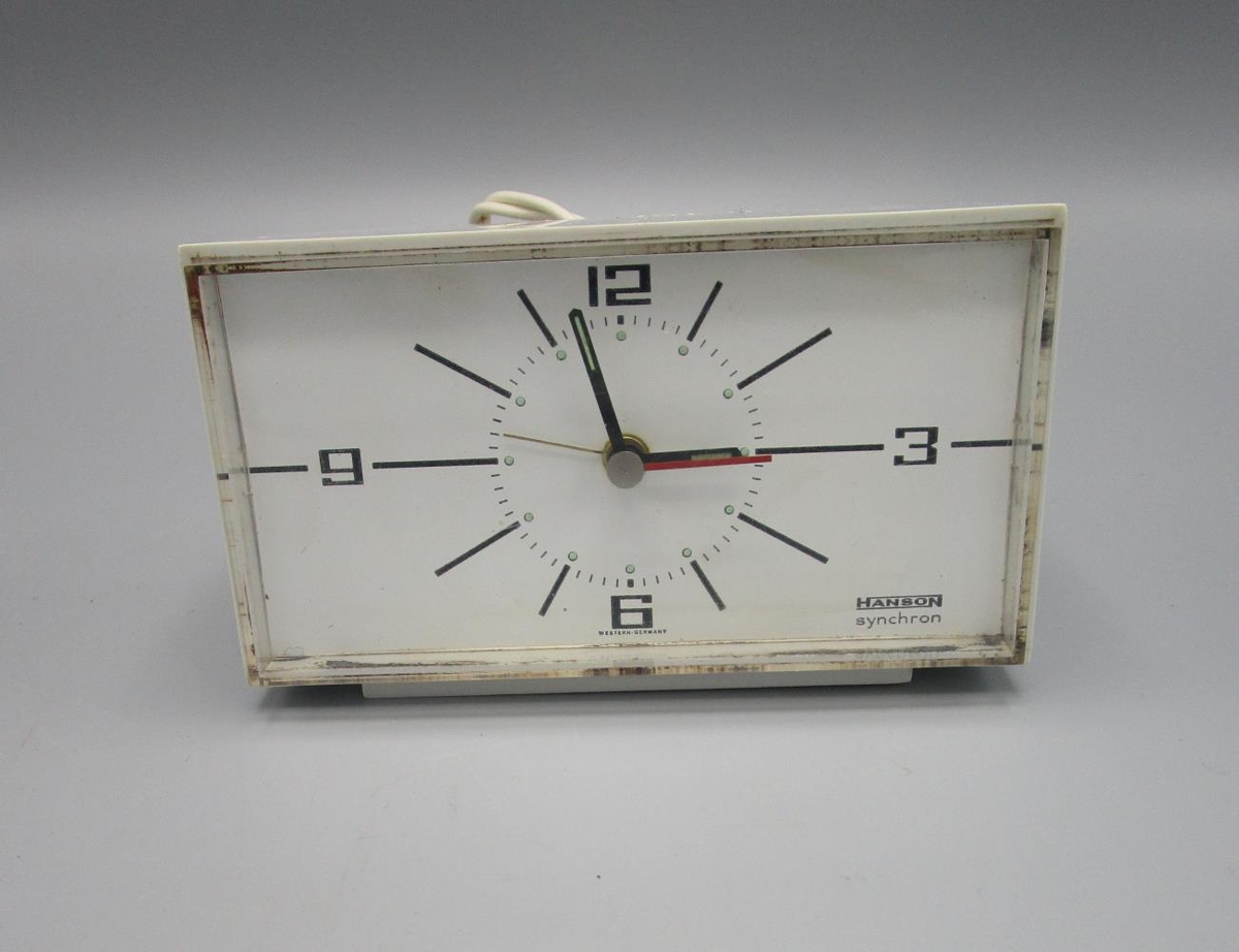 Vekjaraklukka með rafmagnssnúru, hvít með glæru plasit. Merki HANSON synchron.