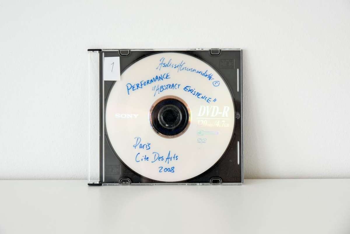 Description: The performer stands in front of a projection in a dark room. She is wearing a fan-shaped silver dress. She moves and speaks while a video starts showing abstract images behind her. Repeating sounds go with the entire performance.