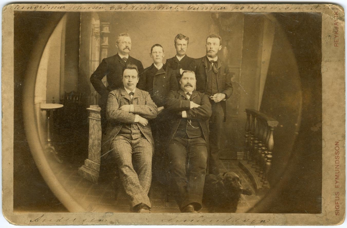 Hópmynd af karlmönnum aðallega verslunarmönnum. Auk þeirra sem eru í nafnaskrá eru tveir menn Andersen og Nielsen en ekki er vitað um nákvæm nöfn þeirra. Nöfn eru á spjaldi myndar.