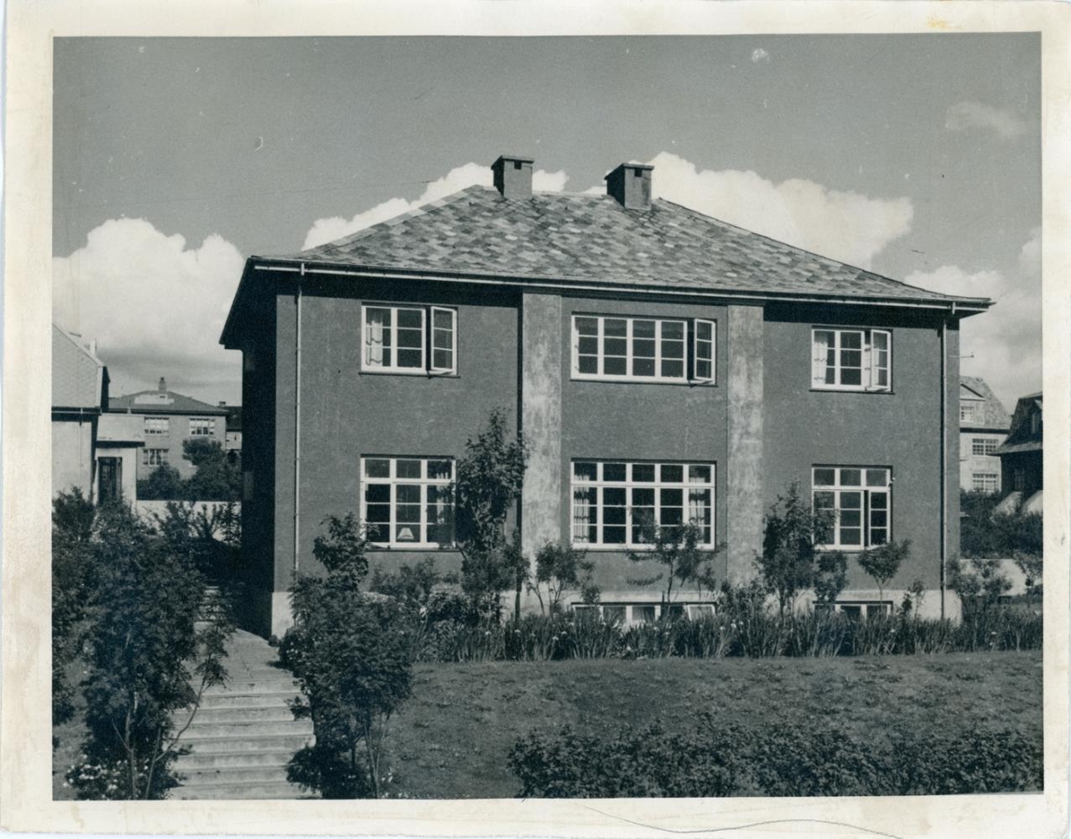 Reisulegt tvílyft steinús á kjallara og með háu risi. Framanvið er garður með trjám og blómagróðri, steintröppur liggja upp að og meðfram húsinu t.v. Listræn ljósmynd.