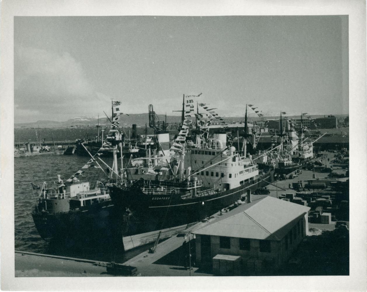Hátíðisdagur í Reykjavíkurhöfn. Nokkur millilandaskip liggja við Miðbakka. Fremst er Goðafoss III. og utan á honum liggur annað skip Eimskipafélagsins, aðeins „foss“ er læsilegt af nafninu, gæti þó verið Lagarfoss. Aftanvið Goðafoss liggur samskonar skip. Fjær liggja togarar við Ægisgarð og Kolakraninn gnæfir yfir.