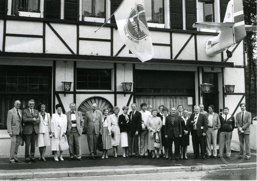 Talið frá vinstri: 1)? 2) Grétar Br. Kristjánsson. 3) Gerður Gunnarsdóttir (kona Grétars). 4) Dýrleif Ármann. 5) Sigurður Magnússon blaðafulltrúi Loftleiða (Dýrleif M. hans kona). 6) Einar Árnason flugvirki. 7) ? 8) Katý (kona Erlings Aspelund). 9) Unnur Hafdís Einarsdóttir (kona Sigurðar Helgasonar). 10) Sigurður Helgason forstjóri Flugleiða. 11) Valgeir Sigurðsson veitingamaður. 12) ? 13) ? 14) ? 15) ? 16) Jóhannes Markússon. 17) ? 18) ? 19) Kristinn Olsen flugstjóri. 20) Björn flugstjóri. 21) Harald Snæhólm flugstjóri.