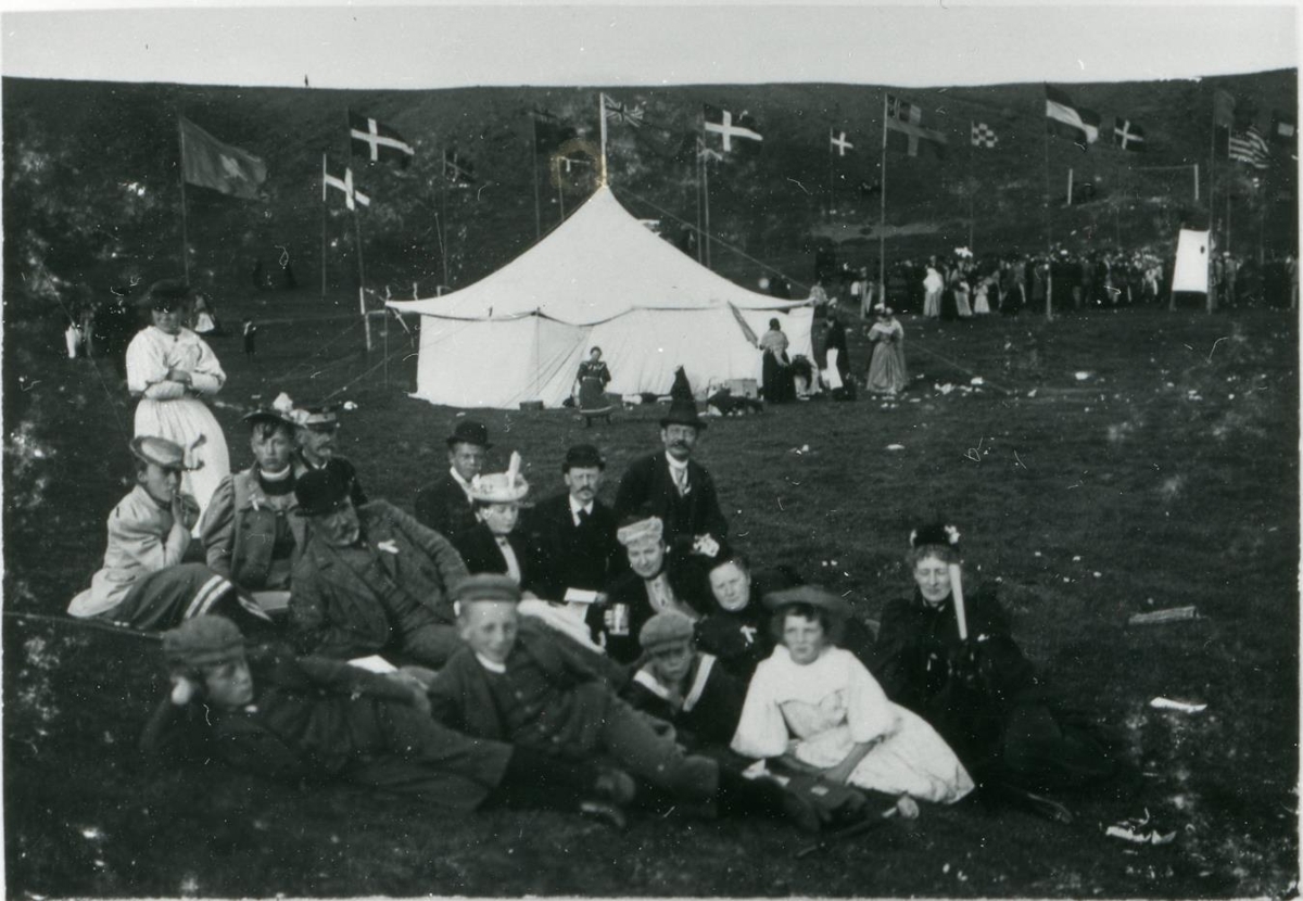 Eftirtaka. Þjóðhátíð við Elliðaár, m.a. Jón Vídalín, Magnús Stephensen, Jón Jacobsen. Stórt samkomutjald í baksýn og danski fáninn við hún.