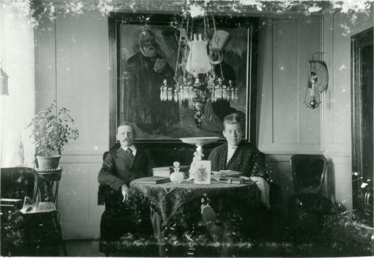 Eftirtaka. Hjónin Jón Jacobson Jakobsson landsbókavörður og Kristín Vídalín sitja í sófa undir stóru málverki.