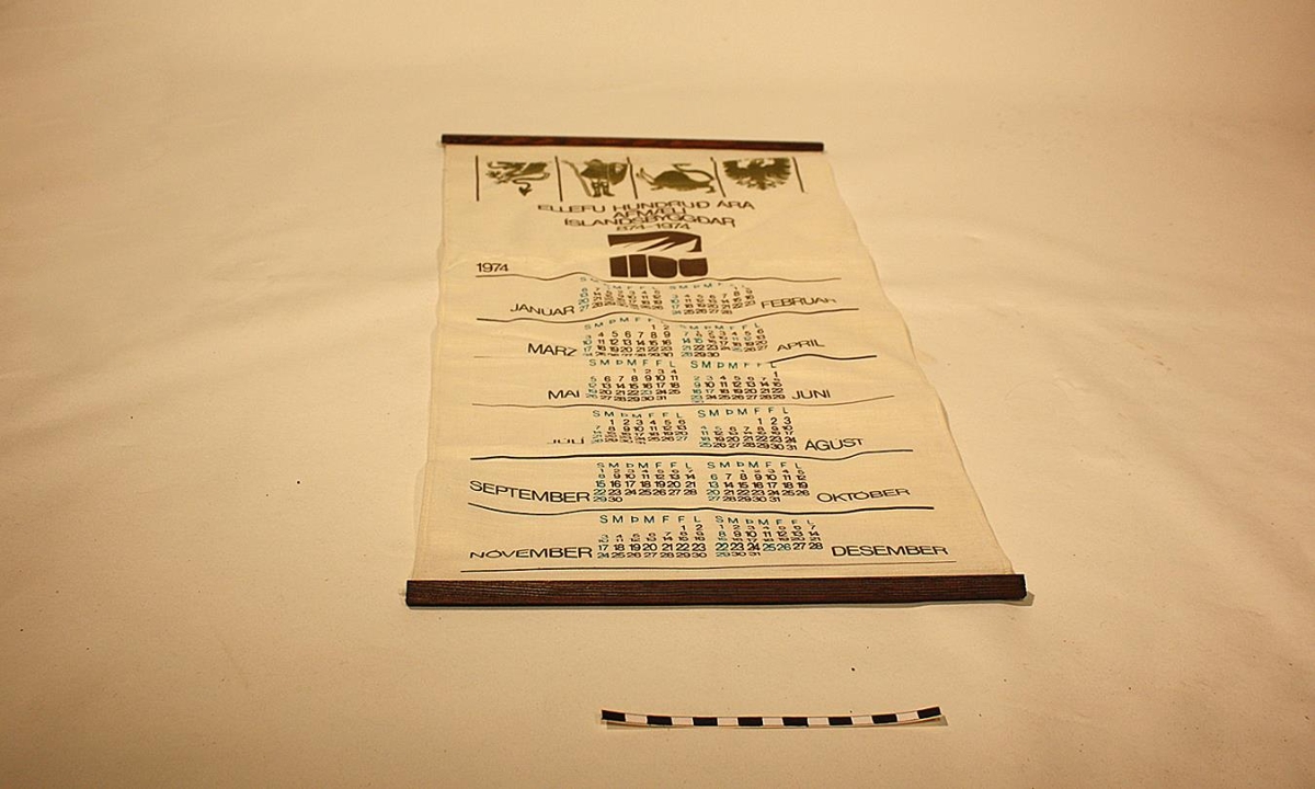 Dagatal fyrir árið 1974, þrykkt á tau til að hengja á vegg. Gefið út í tilefni af 1100 ára afmæli landnámsbyggðar. Myndefni er lógó afmælisársins og fjórir landvættir. Texti á dagatali: Ellefu hundruð ára afmæli Íslandsbyggðar 874-1974. Gefandi Rotaryklúbbur Akraness