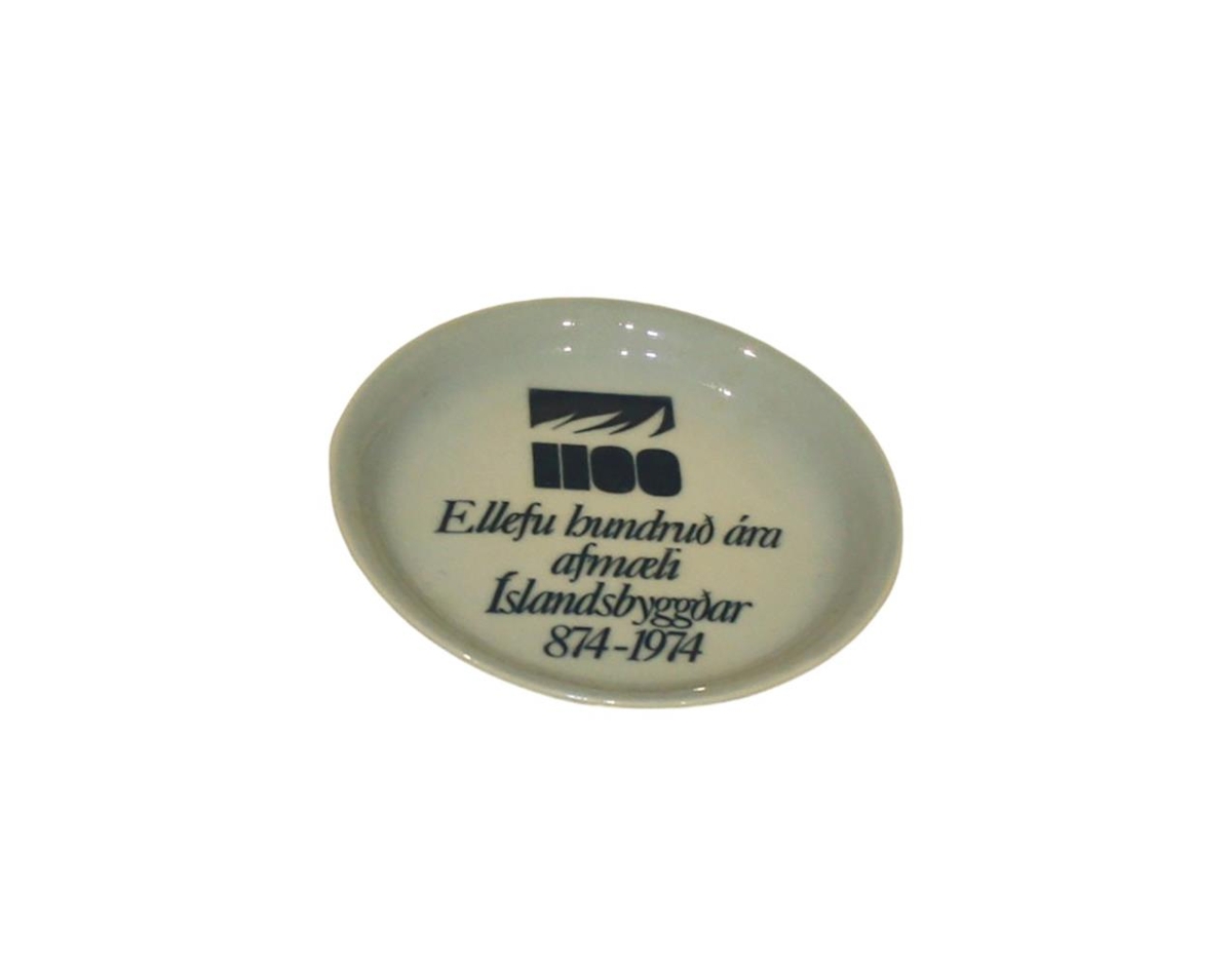 Gefið út af tilefni af 1100 ára afmæli landnámsbyggðar. Myndefni: Lógó afmælisins. Texti á platta: Ellefu hundruð ára afmæli Íslandsbyggðar 874-1974. Þvermál platta 8,9 sm. Gefandi Rotaryklúbbur Akraness