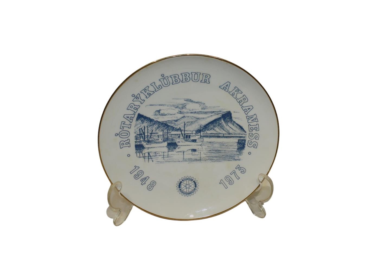 Afmælisplatti í tilefni 25 ára afmælis Rótaryklúbbs Akraness. Myndefni á platta: Akraneshöfn og Akrafjall. Myndefni í bláum lit á hvítum postulínsgrunni. Texti á platta: Rótarýklúbbur Akraness 1948 1973. Útgefin 100 stk., númer á platta er 14/100