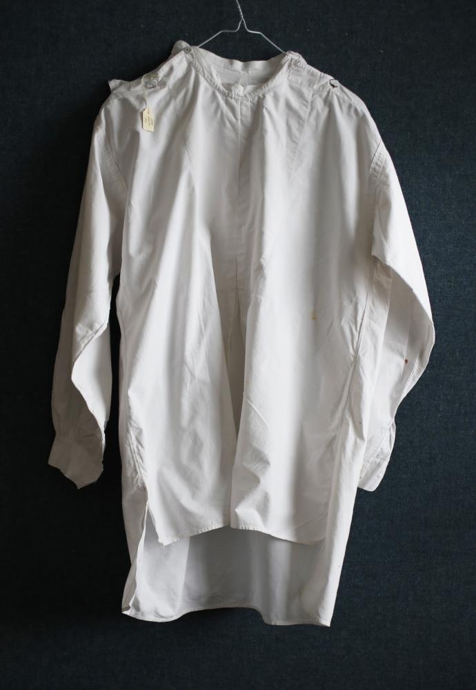 Náttskyrta með löngum ermum, síðari að aftan en framan. Heil alveg uppi í háls og fjórir hnappar á öxlum, tveir á hvorri öxl. Líningarnar hnepptar með einum hnappi. Skyrtan er á karlmann. Kom úr búi Sigrúnar Jóhannesdóttur, Surtsstöðum.