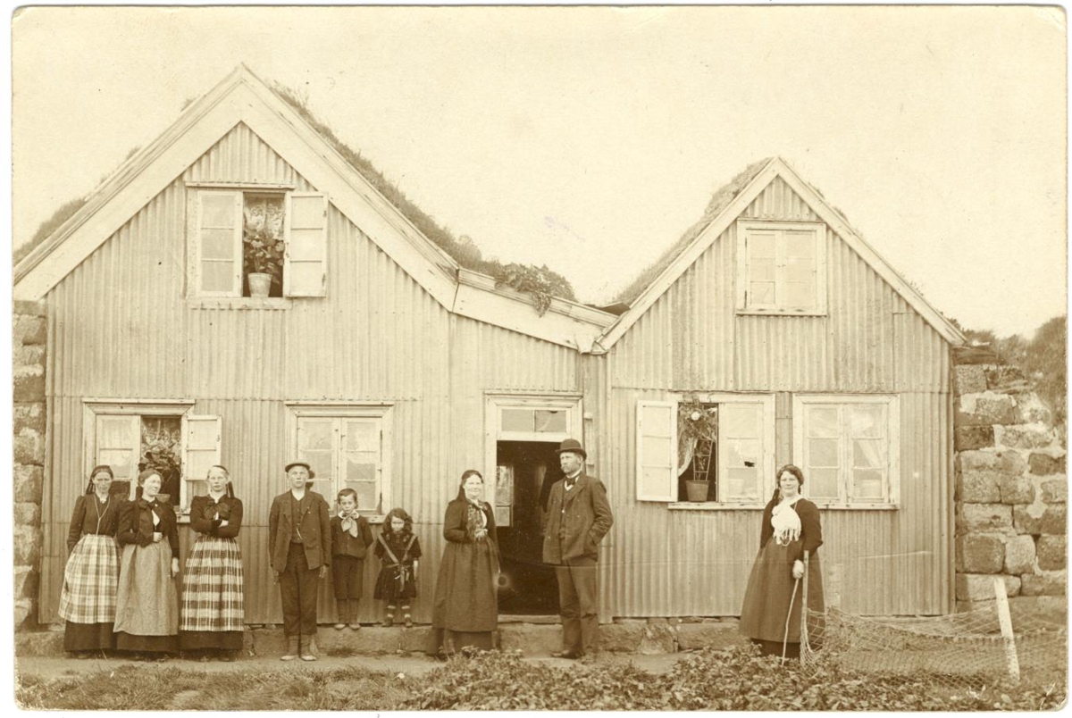 Heimilisfólk uppstillt framan við bæjarþil. Hjónin standa við dyrnar en aðrir til hliðar. Pottablómum hefur verið stillt úti þrjá opna glugga. Sama mynd og ÓJ-177, Texti aftan á kortinu skrifaður af Önnu læknisfrú til systurdóttur hennar Sigríðar Þórarinsdóttur á Valþjófsstað 14.1.1915.