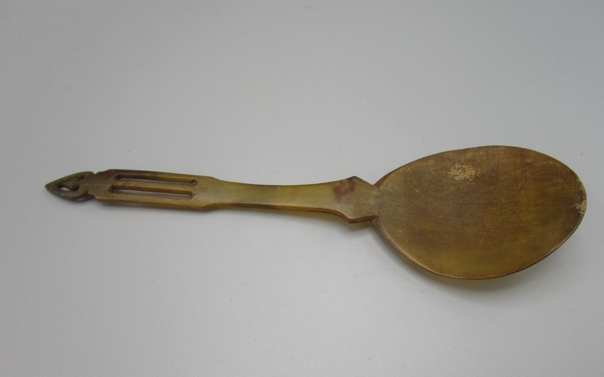 Spónn, hornspónn. Breið skeið, skaftið endar í 3 örmum og svo í spaða með litlum turni.