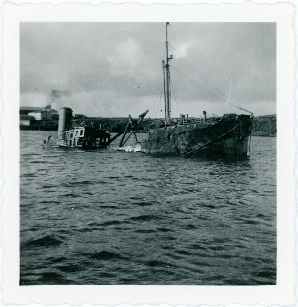 Frá veru Breska hersins á Íslandi í seinna stríði. Gufuknúinn togari marar í hálfu kafi og situr sennilega á grynningum. Sjávarbakki í baksýn og fjærst t.v. sér í nokkuð stórar byggingar.