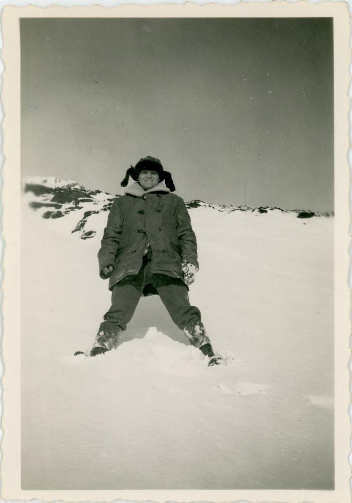 Frá veru Breska hersins á Íslandi í seinna stríði. Hermaður í vetrarfatnaði stendur í snjóskafli.