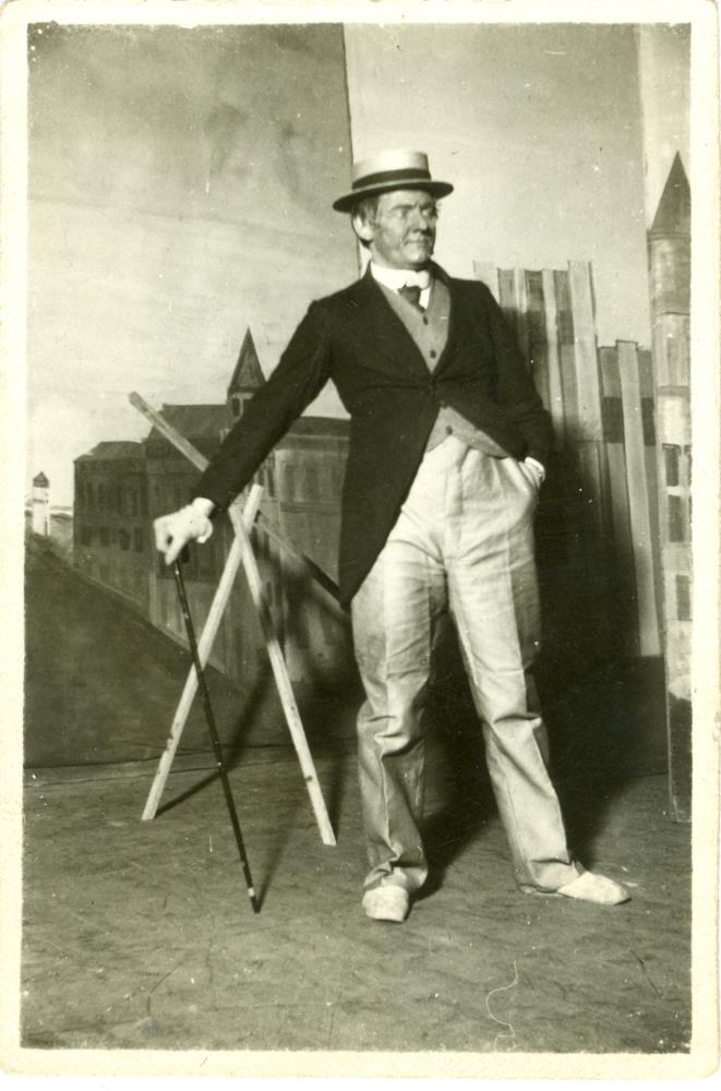 Leikari í jakkafötum með hatt á sviði. Málað baktjald með húsum í bakgrunni. Leikari í revíu á vegum Reykjavíkurannáls.