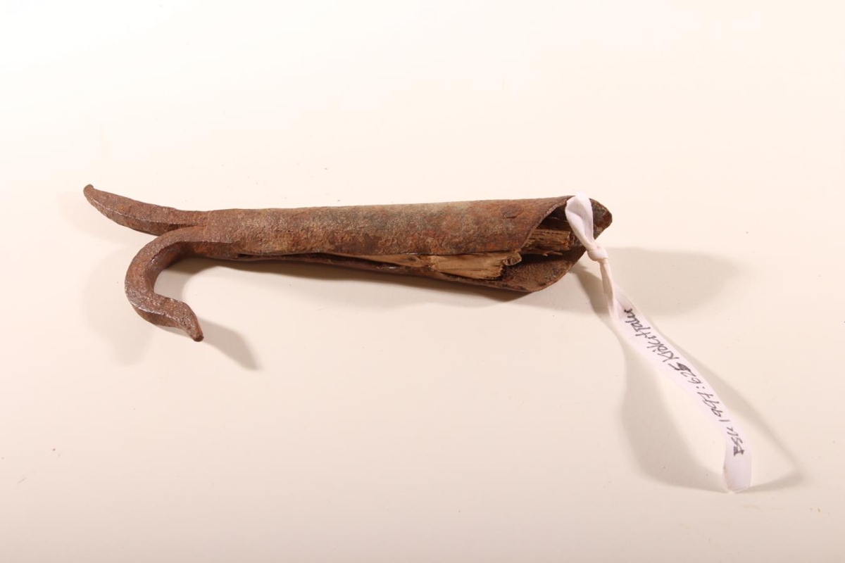 Krókstjaki, járn broddur með krók. Lengd 24,5 cm. Holt að innan að hluta til þar sem skaftið gekk aftan í. Skaft krókstjaka var yfirleitt langt tréprik. Þessi var í eigu Bjarna Jónssonar sjómanns.