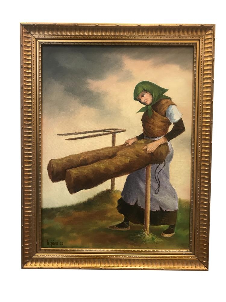 Málverk af konu að þræða sjóbrækur upp á brókarkvísl. Aftan á myndinni stendur: Brókarkvísl.