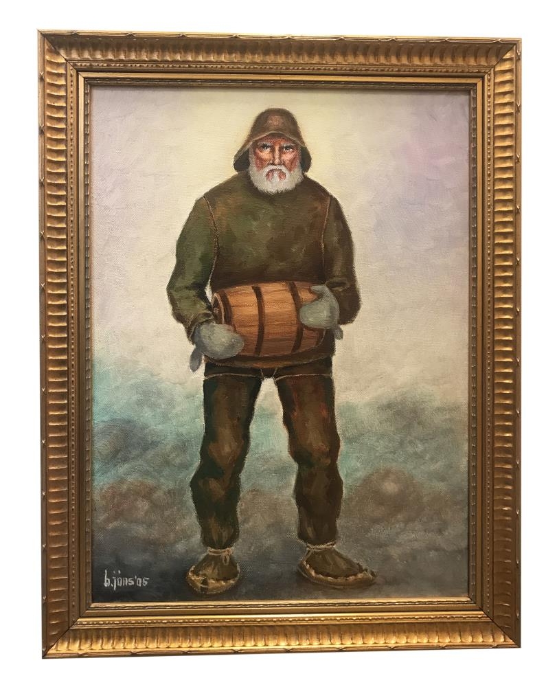 Málverk af sjómanni í skinnklæðum með tunnu. Aftan á myndinni stendur: Verztfisk skinnklæði.