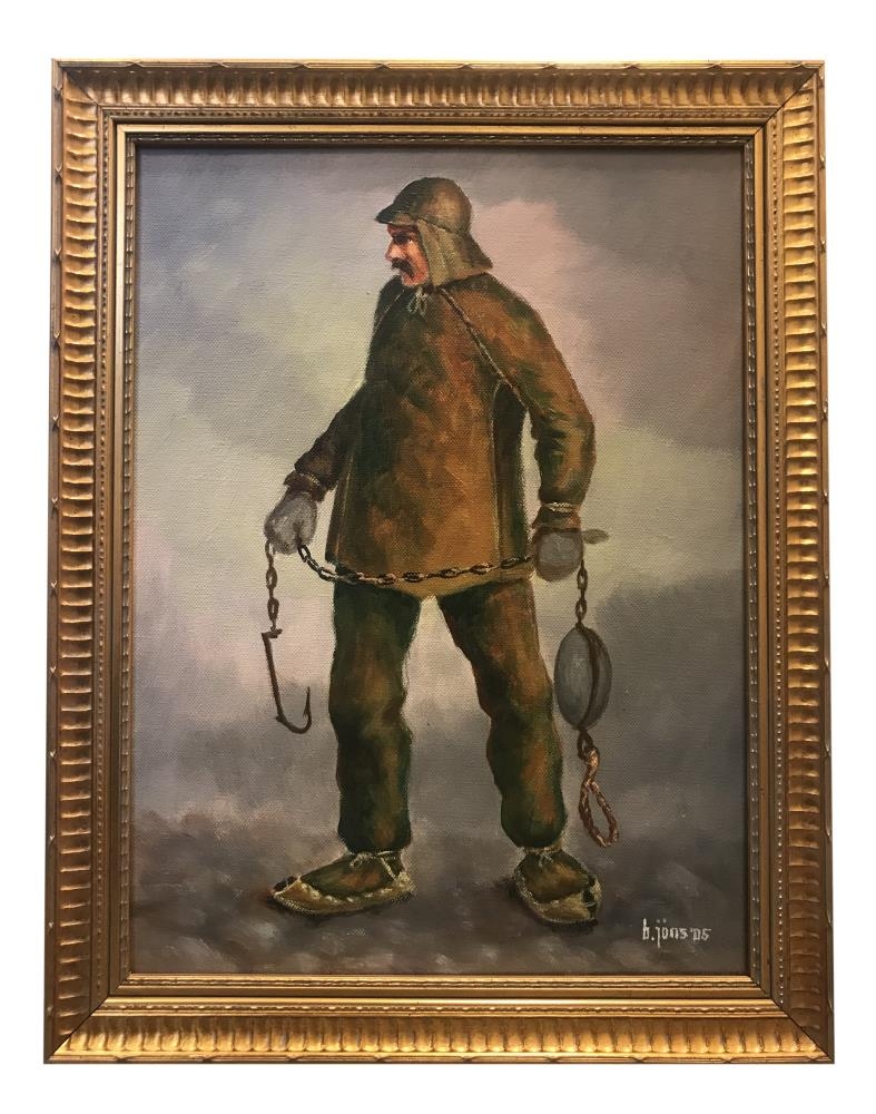 Sjómaður í skinnklæðum. Hann heldur á handvað. Aftan á myndini stendur: Heiðinn stakkur.