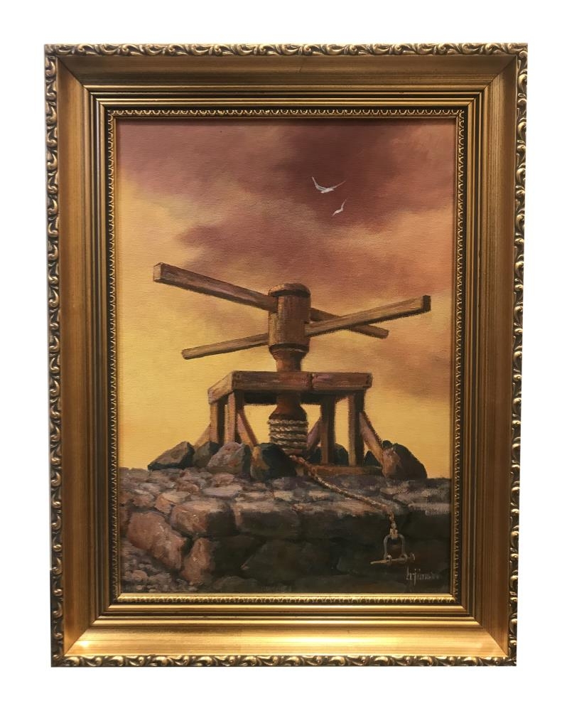 Málverk af gangspili. Aftan á myndinni stendur: Gangspilið Kr. 30.000.