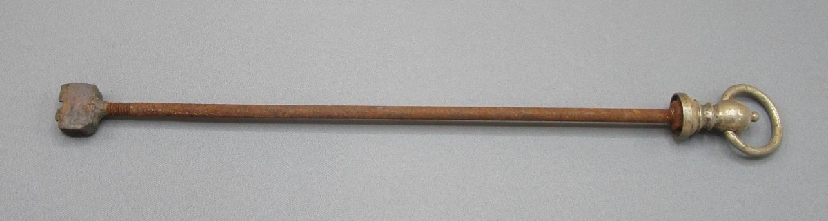 Brennijárn, brennimark Jónasar Pálssonar í Elliðaey. Merkt JP. Skaftið er úr járni en á enda þess er skrúfaður hnúður úr öðrum málmi með hring til að hengja járnið upp.