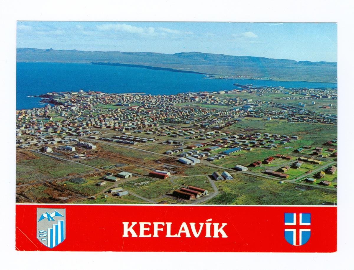 Póstkort af Keflavík frá því um 1978. Við botninn er borði sem er með skjaldarmerki Keflavíkur og íslenska fánann og ritað Keflavík á milli merkjanna.