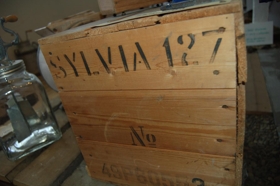 Skilvinda Páls Jónssonar frá Bjarnastöðum í Hvítársíðu. Skilvindur sem þessi voru notaðar á flestum bæjum fram yfir miðju síðustu öld. Hún stendur á kassa sem merktur er sömu tegund og hún er (SYLVIA). Skilvindan er heilleg og er úr búi foreldra Páls, ca. 1940 - 1945.