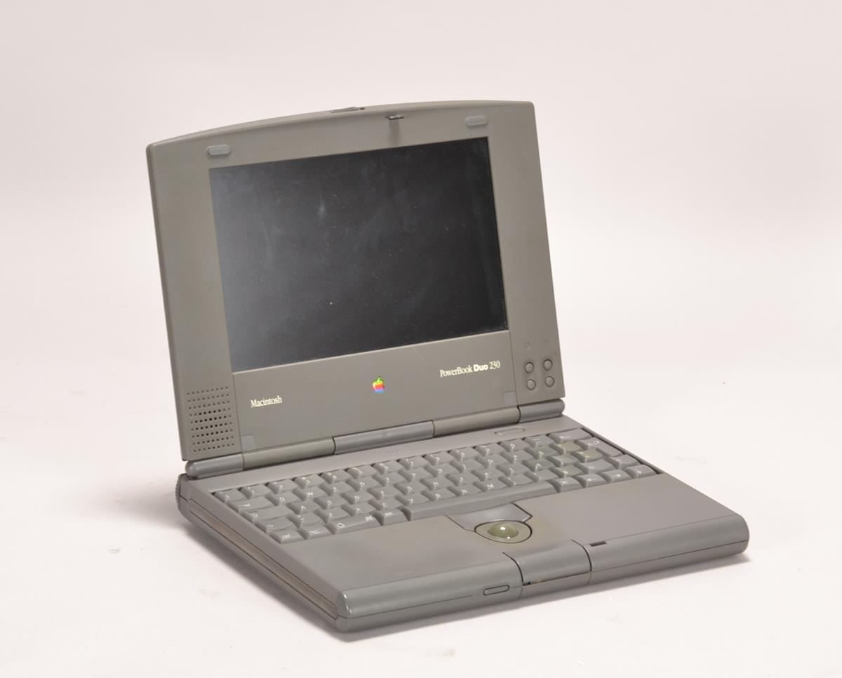 Grá Macintosh PowerBook Duo fartölva ásamt fylgihlutum og tösku (BYR 2019-89-1, BYR 2019-89-2, BYR 2019-89-3 og BYR 2019-89-4)