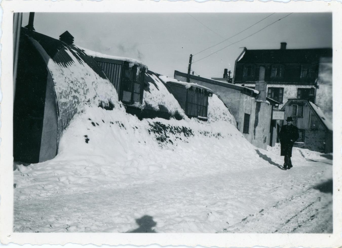 Frá veru Breska hersins á Íslandi í seinna stríði. Snjór á jörð. Karlmaður með hatt gengur meðfram bragga og húsi með skúrþaki. Á vegg húsinns hangir skilti sem á stendur NAVASTRA HOUSE. Aftar lítið hús með toppsniðnu risþaki og fjærst þriggja hæða hús.