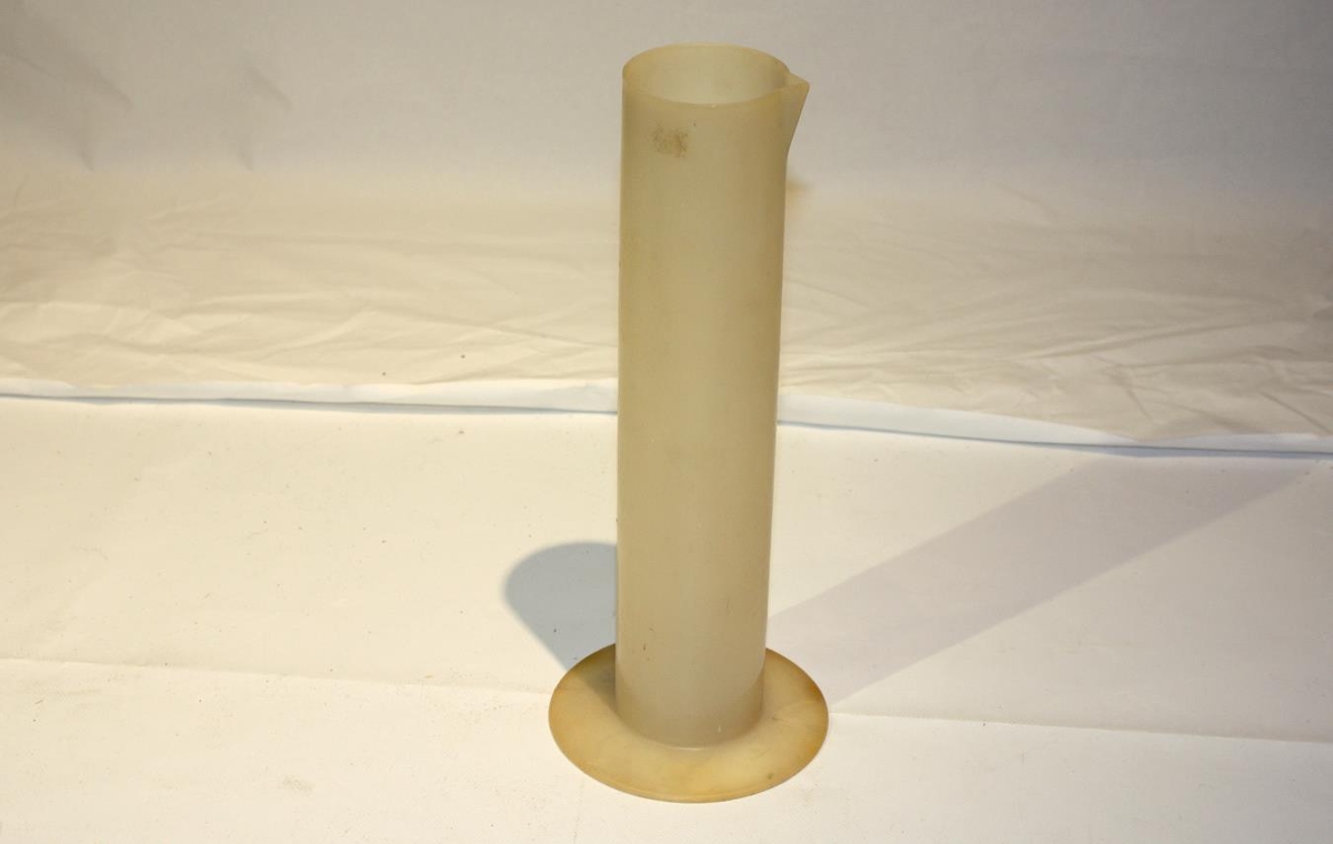 Mæliglas sem stendur á fæti. Fyrir 1000 ml mælieiningar. Notað við framköllun. Hæð 32 sm og þvermál 13,5