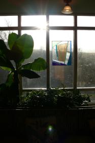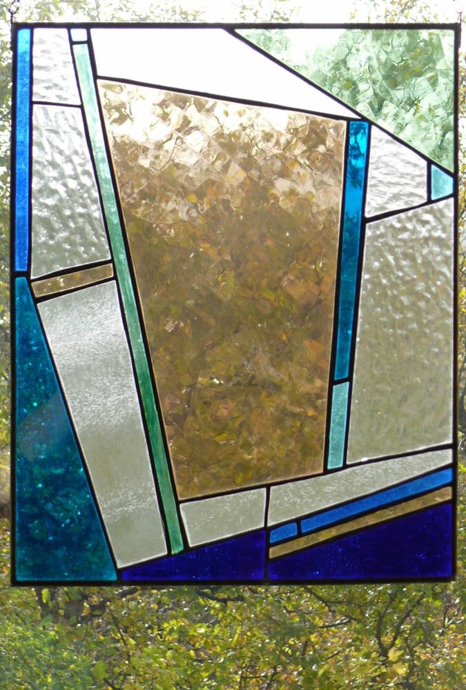 Ferhyrnt glerlistaverk. Aðallega bláleitt og grænt en einnig reyklitað og glært. Listamaður, Vigdís Pálsdóttir eiginkona Baldvins Halldórssonar náfrænda Auðar.