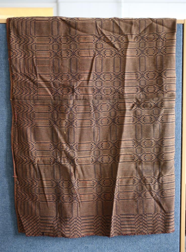 Rúmteppi. Ofið með salún aðferð úr heimaspunnu ullarbandi í þremur brúnum litum. Teppið er úr tveimur lengjum sem saumaðar eru saman. Teppið er unnið af Björgu Sigbjörnsdóttur á Litla-Bakka í Hróarstungu, bæði spuni og vefnaður.
