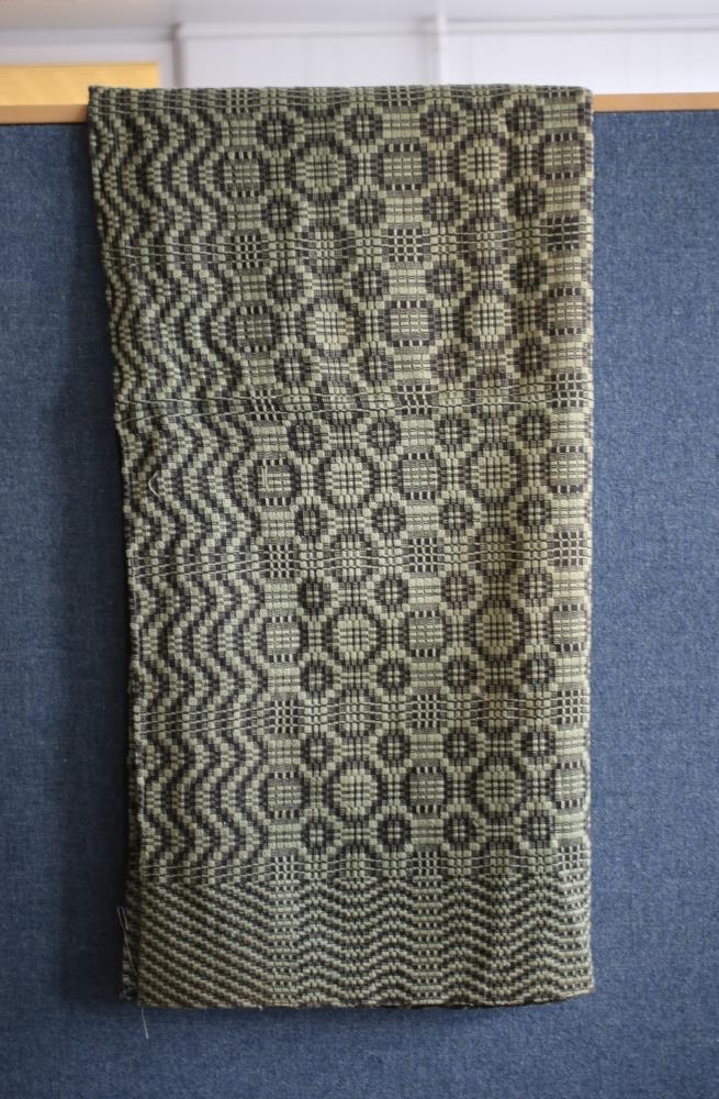 Rúmteppi. Ofið með salún aðferð úr grænu, svörtu og blágrænu ullarbandi. Teppið er unnið af Björgu Sigbjörnsdóttur á Litla-Bakka í Hróarstungu, bæði spuni og vefnaður. Á teppinu eru tvær rifur fyrir miðju.