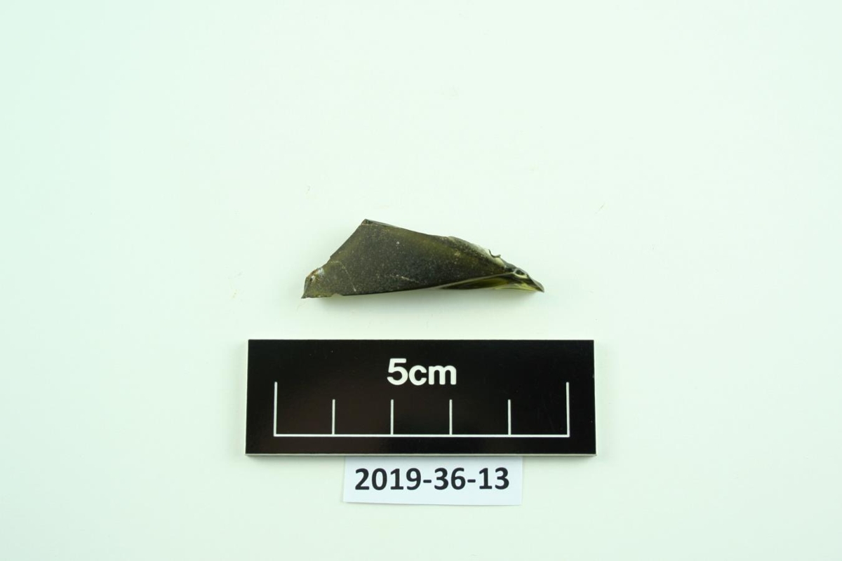 Grænbrúnt glerbrot, matt á einni hlið, mögulega vegna einhvers konar húðunar.