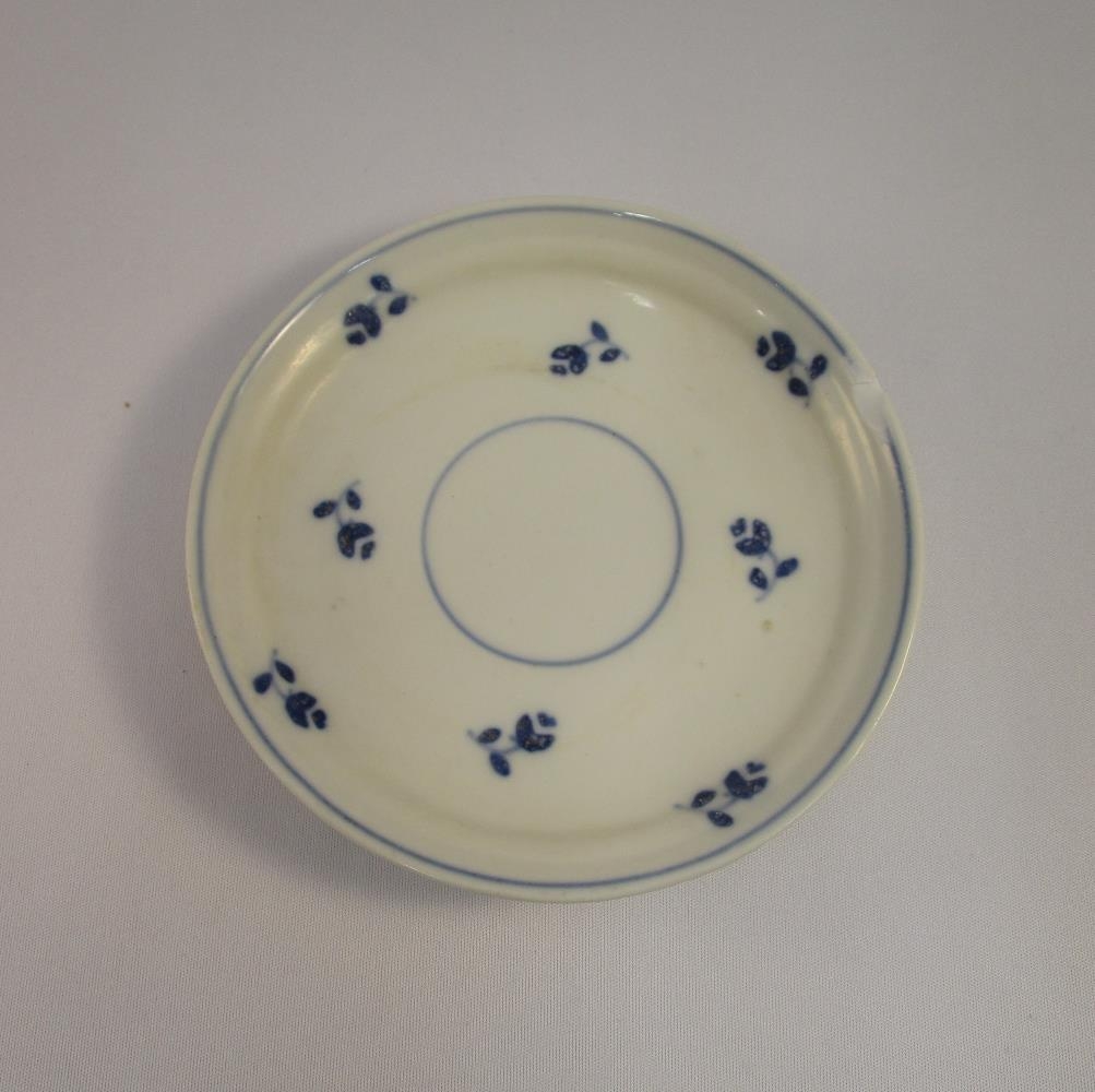 Hvít undirskál með átta bláum blómum.