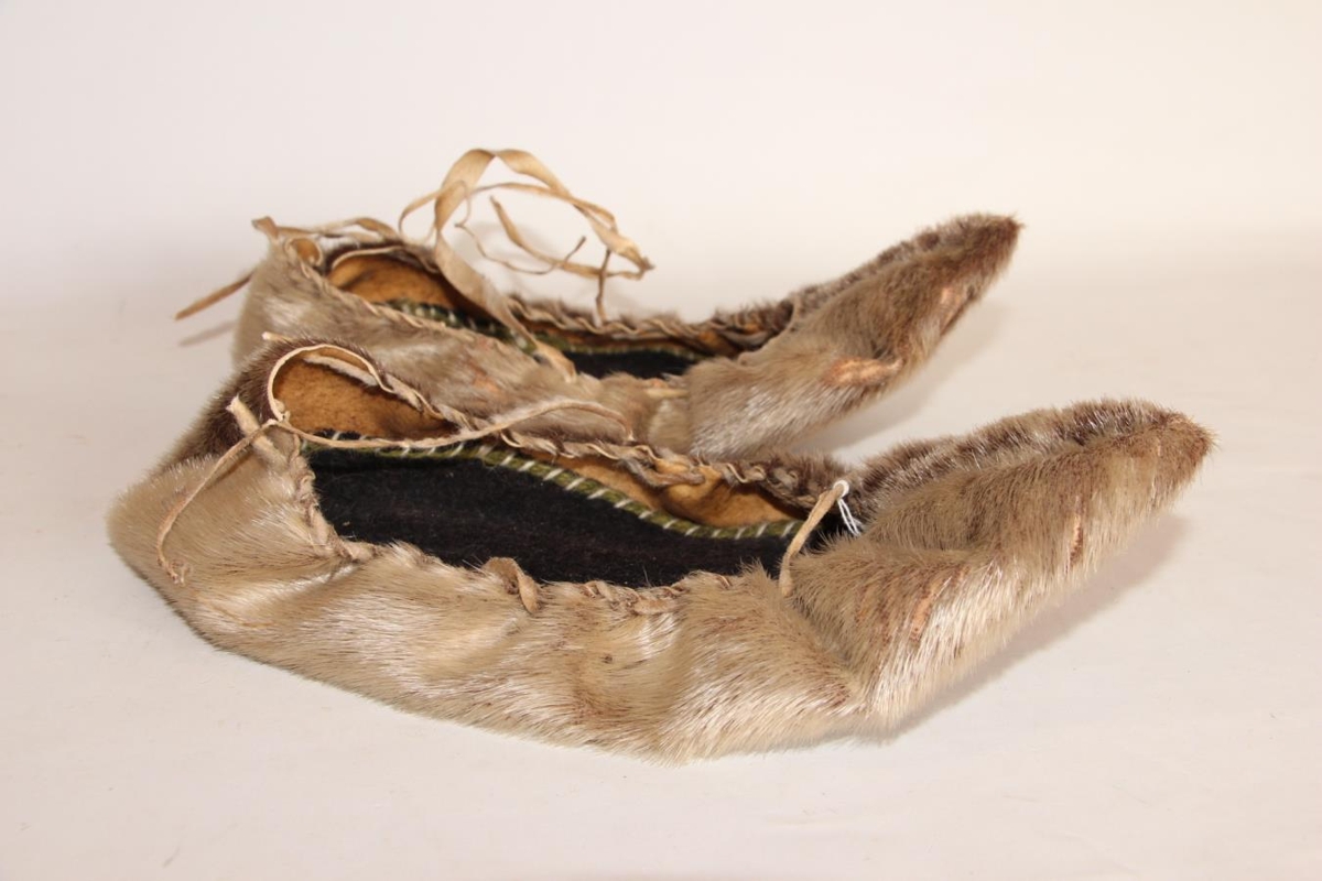 Selskinnsskór (hringanóraskinn). Lengd 32 cm, breidd 11,6 cm. Skórnir eru ljósgráir annars vegar en dekkri gráir hins vegar. Saumaðir með ljósu bómullarbandi á hæl og tá, og varpaðir með þveng (ljósri skinnræmu sem líkist kattaskinni) og ristarólin er úr því sama. Dökkgráir illeppar með brydduðum brúnum með grænu ullarbandi sem varpað er á með ljósum bómullarþræði eru í skónum.