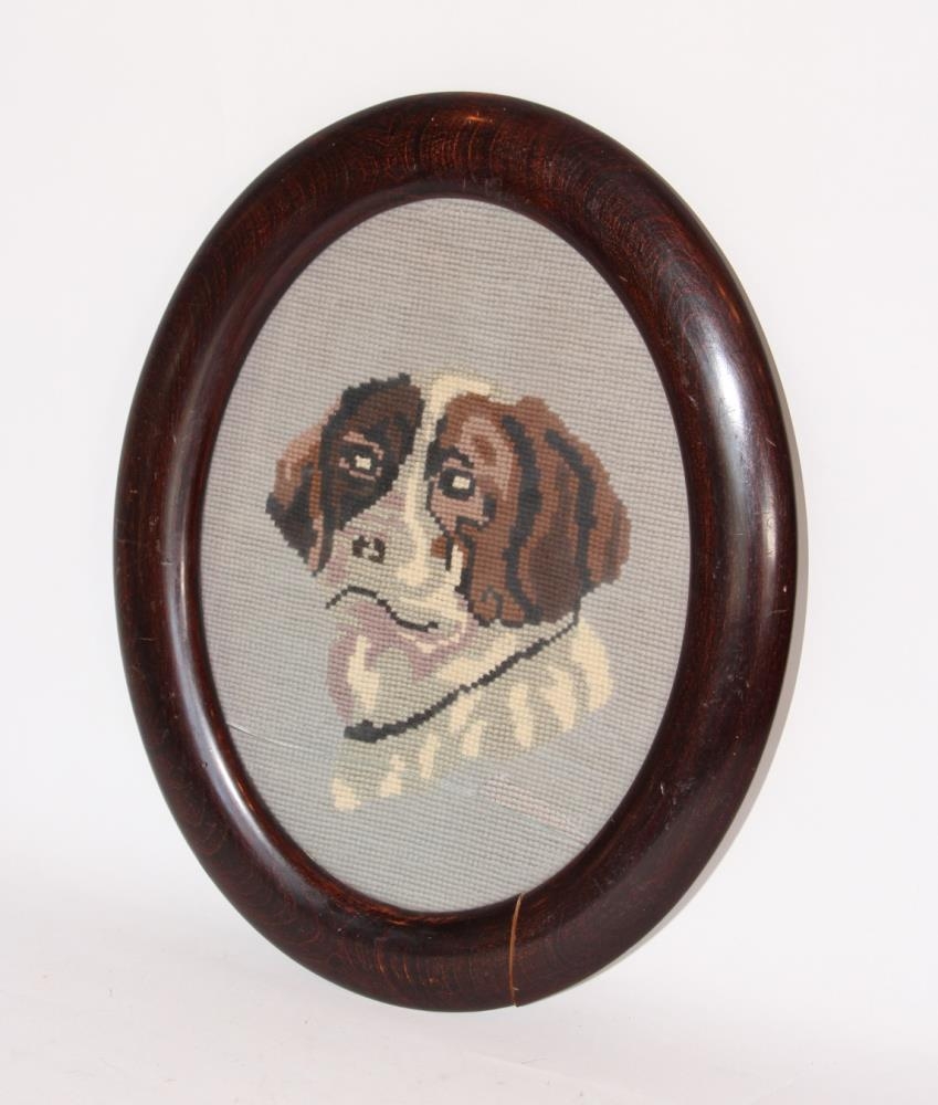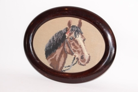 Útsaumaðar myndir, úttalið mynstur, krosssaumur. Myndirnar eru allar í sporöskjulaga trérömmum, 4 cm breiðum, þvermál 35 cm á langveginn og 28 cm á þann styttri. (A) er með mynd af hesti, (B) af ketti og (C) af hundi.