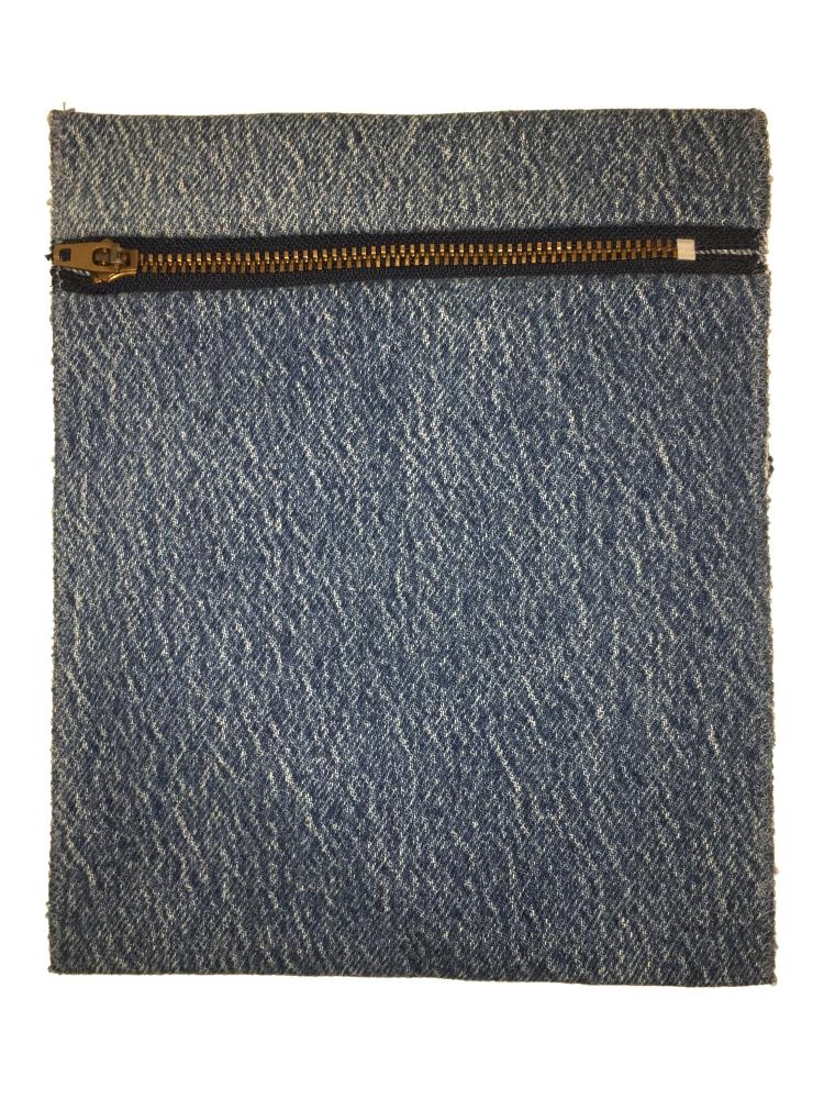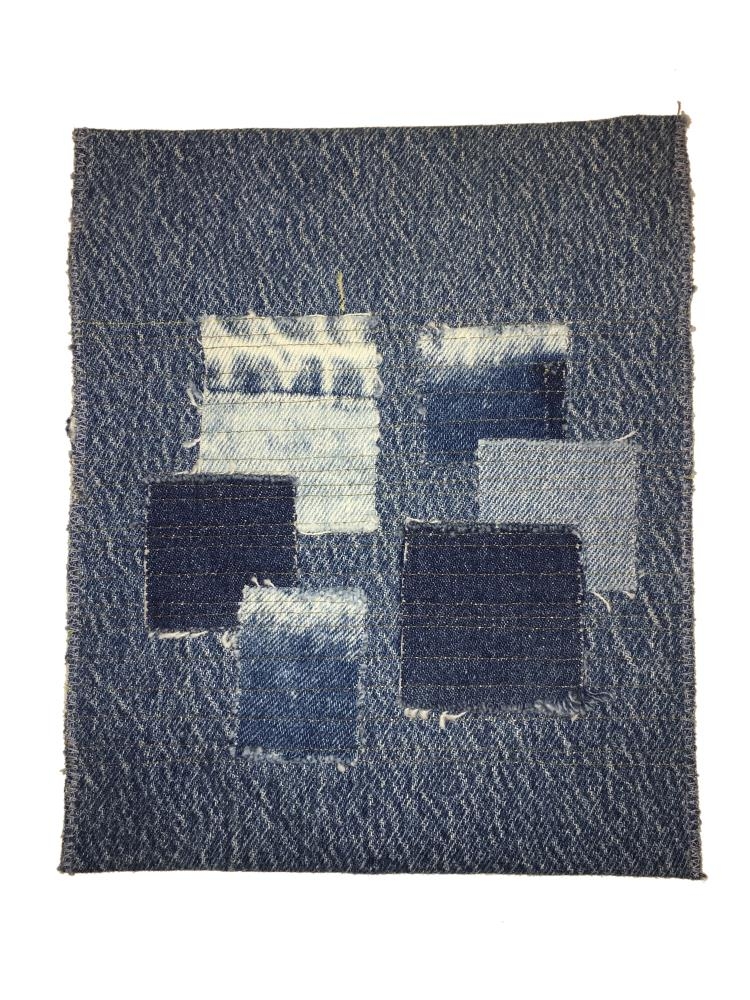 Rennilásabudda. Ferningur. Skreytt með bútum / formum (taubútum) sem eru saumaðir niður með beinum saumi í saumavél. Saumað er með fínum málmþræði.