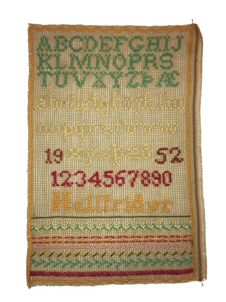 Prufuklútur, stafaklútur, saumaður í brúnan fíngerðan stramma.Klútinn saumaði Hallfríður í Barnaskóla Akureyrar árið 1952 þegar hún var 10 ára gömul. Útsaumsgerðir: Stafrófið er saumað bæði með hástöfum og lágstöfum, einnig tölustafirnir frá 0 – 9 og ártalið 1952. Allt saumað með krosssaumi. Neðst á prufunni er nafnið Hallfríður einnig saumað með krosssaumi og þar fyrir neðan eru nokkur einföld útsaumsspor. Útsaumsgerðir: Afturstingur, ídregið krókspor, tvöfalt ídregið þræðispor, lykkjuspor, oddaspor saumað með tveimur litum, klóspor og skásaumuð góbelínspor (glitsaumur). Saumuð er fín lína með krosssaumi utan um útsauminn. Línan myndar smá munstur að ofan og að neðan.