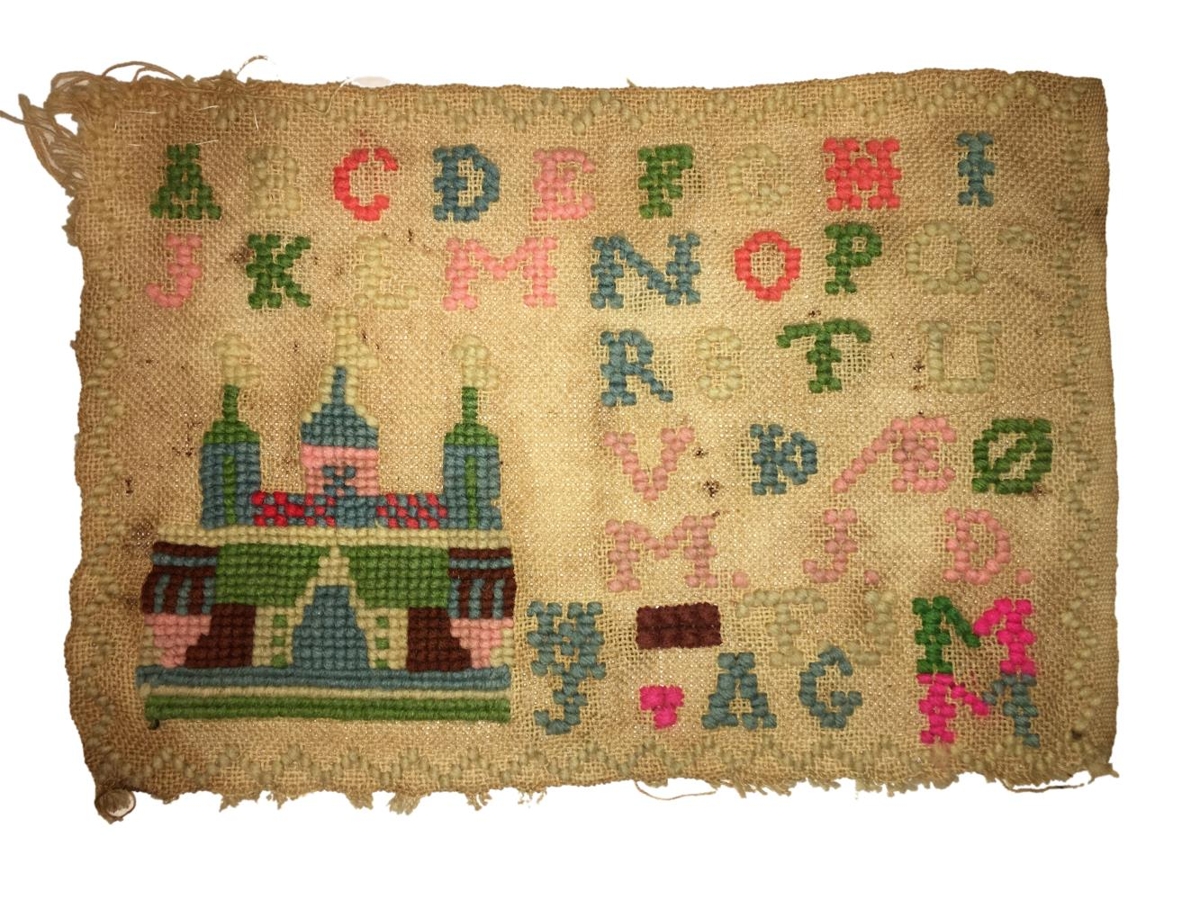 Lítil og snjáð prufa, stafaklútur. Ekki vitað um uppruna. Ljóst efni / einskeftuvefnaður. Stafrófið er saumað með krosssaumi í nokkrum litum. Í neðra hornið vinstra megin er saumuð mynd af höll, einnig með krosssaumi. Utan um prufuna er saumaður örmjór munsturkantur með krosssaumi. Ekki er vitað hvaðan prufan kemur, en hún er greinilega mjög gömul. Efnið er snjáð af notkun og farið að rakna upp úr köntum. Stærð 21.5 x 14.5 sm. Prufan var keypt í Kolaportinu eða á flóamarkaði.