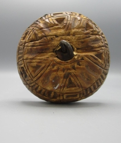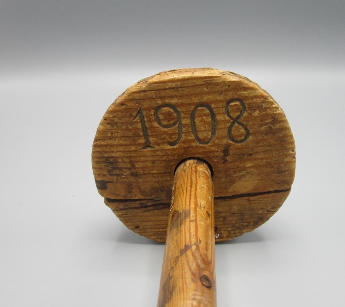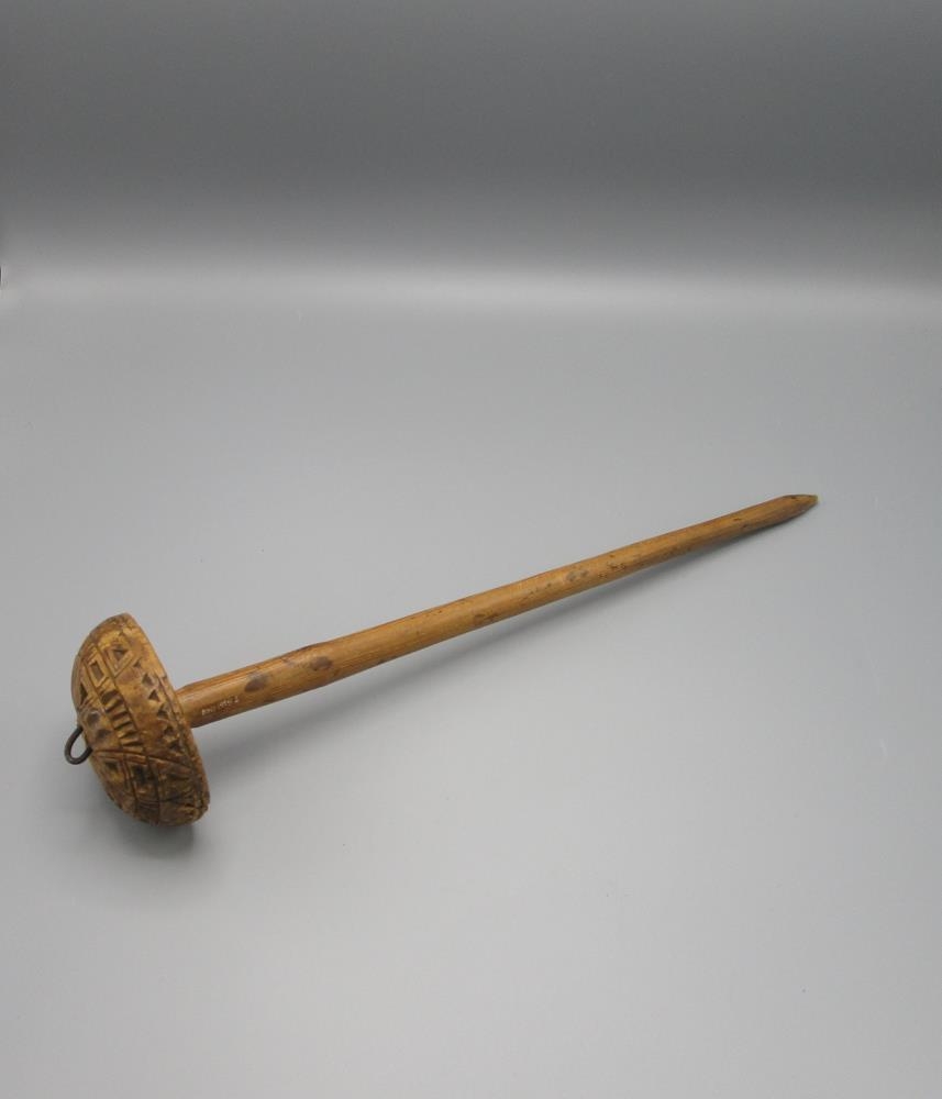 Hrosshárssnælda. Útskorinn snúður (Þv. 10 cm), undir honum áletrun 1908.