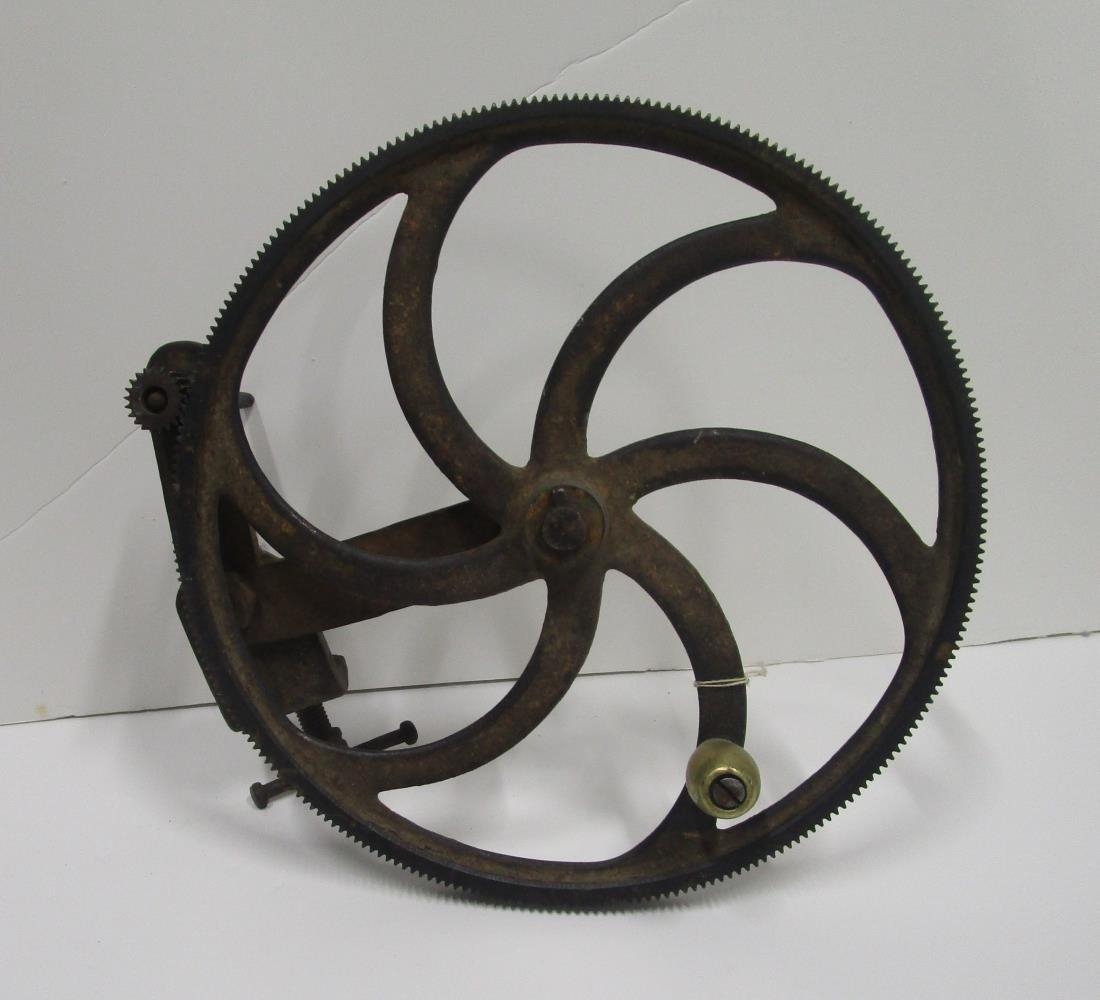 Spólurokkur úr járni. Smíðaður af Hannesi í Dældarkoti, nema hjólin sem eru úr skilvindu.
