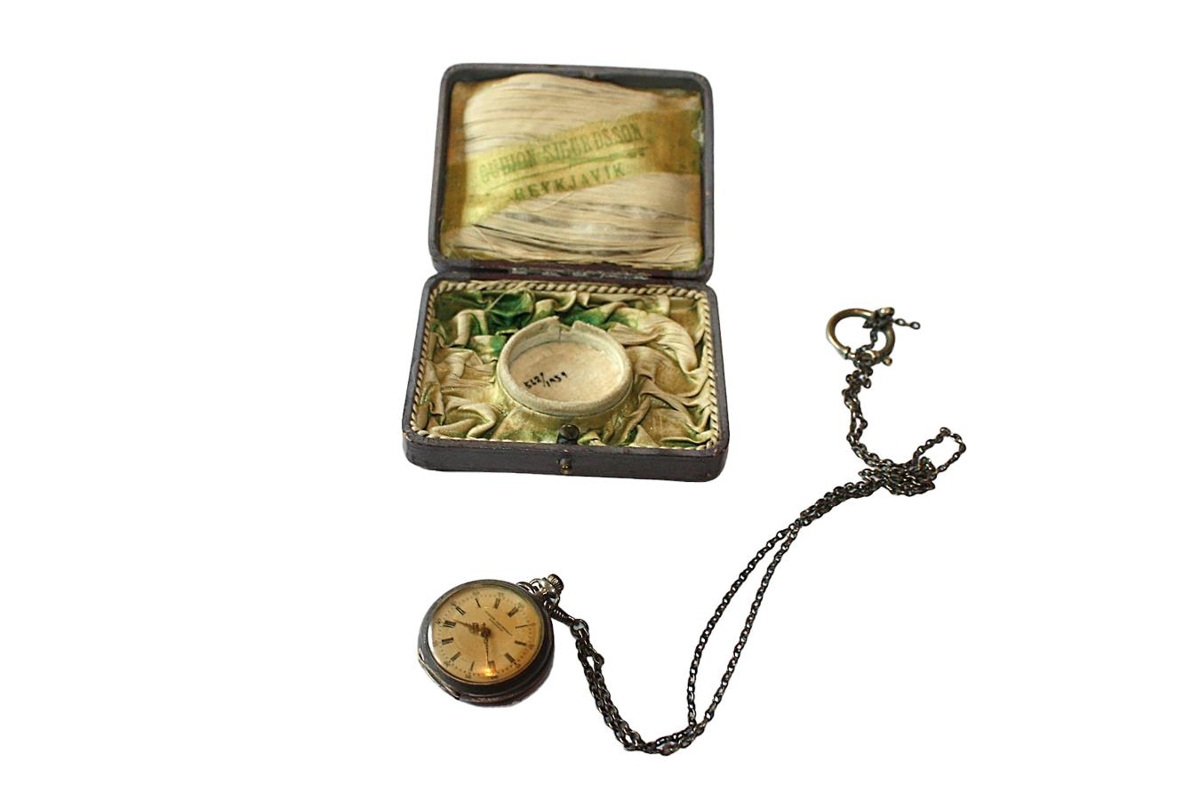 Kvenúr með festi. Úr þetta átti Sigurveig Eyjólfsdóttir húsfreyja í Skálatanga í Innri-Akraneshreppi (f.18.10.1915 í Merkinesi í Höfnum). Sigurveig ólst upp í Útverkum á Skeiðum frá barnsaldri. Áður átti úrið Sigurveig Símonardóttir föðursystir hennar er var vinnukona í Útverkum í 47 ár (d.1948). Sigurveig í Skálatanga eignaðist úrið eftir hana og gaf safninu 1969.
