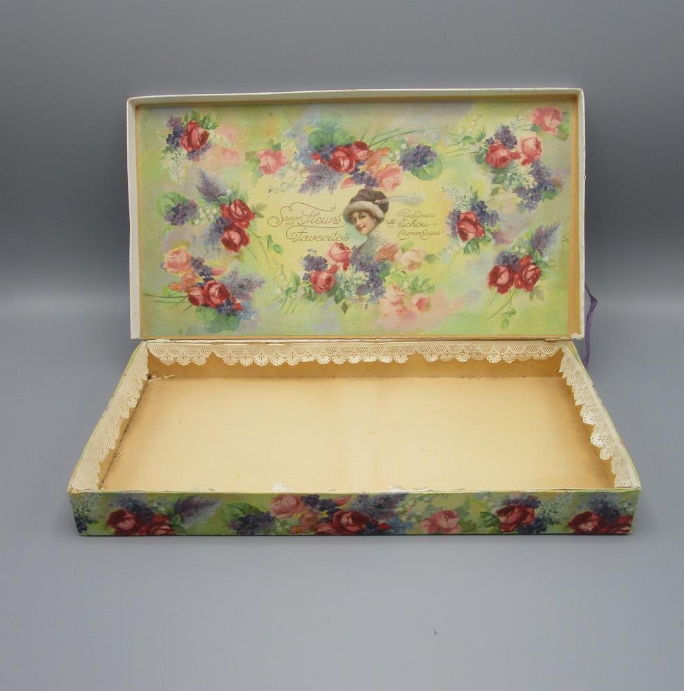 Hefur upprunalega verið undir ilmvötn eða þ.h. "Savon Fleurs Favorites, Parfumeries". Mikið af rósamyndum. Brúnn ofaná loki. Bréfblúnda hringinn að innan