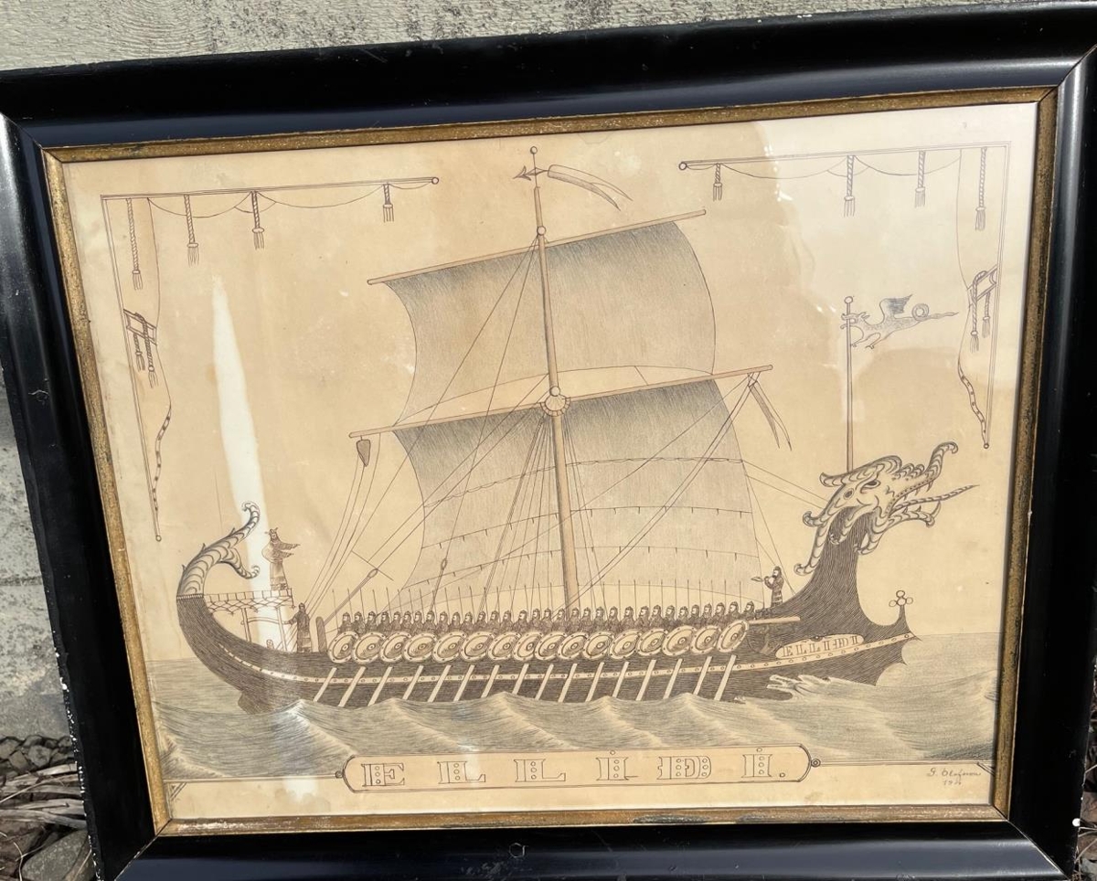 Innrömmuð teikning, Á meðfylgjandi mynd stendur: "Víkingaskipið Elliði. Teikning Guðlaugs Ólafssonar (1869 - 1913). Hann var Snæfellingur, síðast búsettur í Stykkishólmi. Gor sækonungur átti Elliða (Fornaldarsögur Norðurlanda).